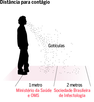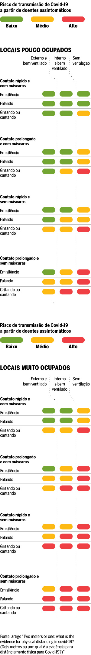 Os exemplos acima foram pinçados após entrevistas com especialistas. Foram usadas as diretrizes estabelecidas pelo Ministério da Saúde e a Organização Mundial da Saúde (OMS) sobre os meios de contágio. Esses órgãos consideram que o SARS-CoV-2 é transmitido principalmente por gotículas respiratórias entre pessoas que estão a cerca de um metro de distância entre elas. Mas podem haver variações nesses critérios. A Sociedade Brasileira de Infectologia (SBI), por exemplo, recomenda distanciamento de dois metros, estimativa que se baseia em estudos sobre a distância percorrida por gotículas no ar.