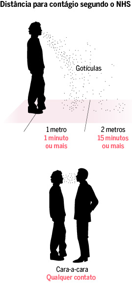 O Sistema de Saúde do Reino Unido (NHS) usa critérios mais específicos para identificar contatos potencialmente contagiosos. São considerados suspeitos contatos de um metro de distância durante ao menos um minuto, e também a dois metros de distância, com duração de 15 minutos ou mais. Além disso, qualquer contato cara-a-cara é considerado passível de transmissão.