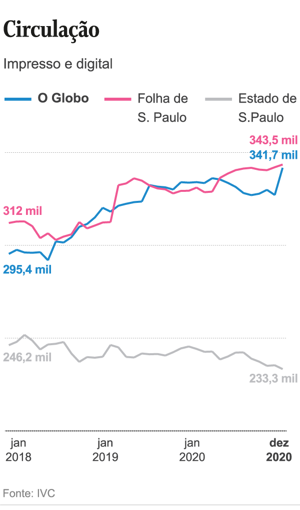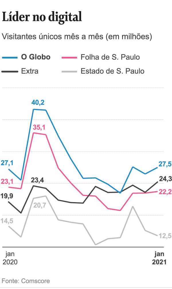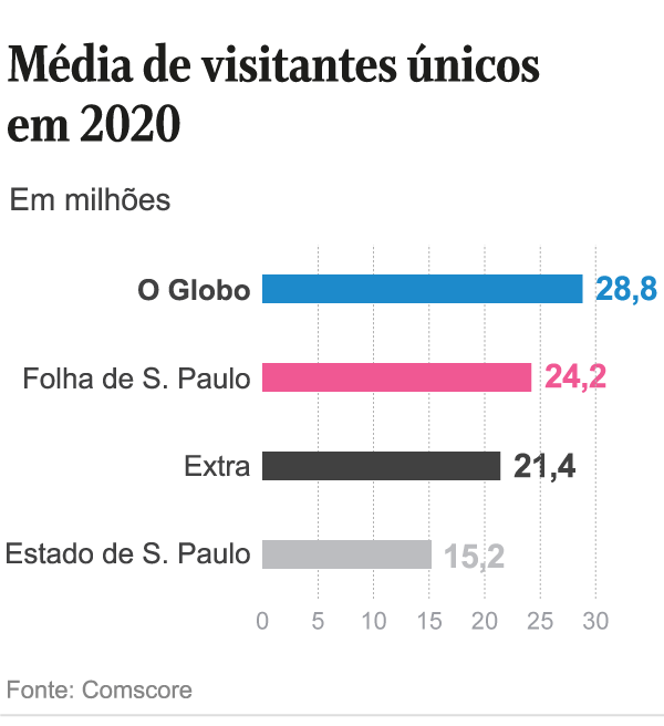 De acordo com a Comscore, referência mundial na análise do tráfego em conteúdos na internet, O GLOBO teve uma média de 28,8 milhões de visitantes únicos por mês em 2020, liderando o segmento de grandes jornais. “A Folha de S.Paulo” ficou em segundo, com 24,2 milhões; e “O Estado de S.Paulo”, 15,2 milhões.