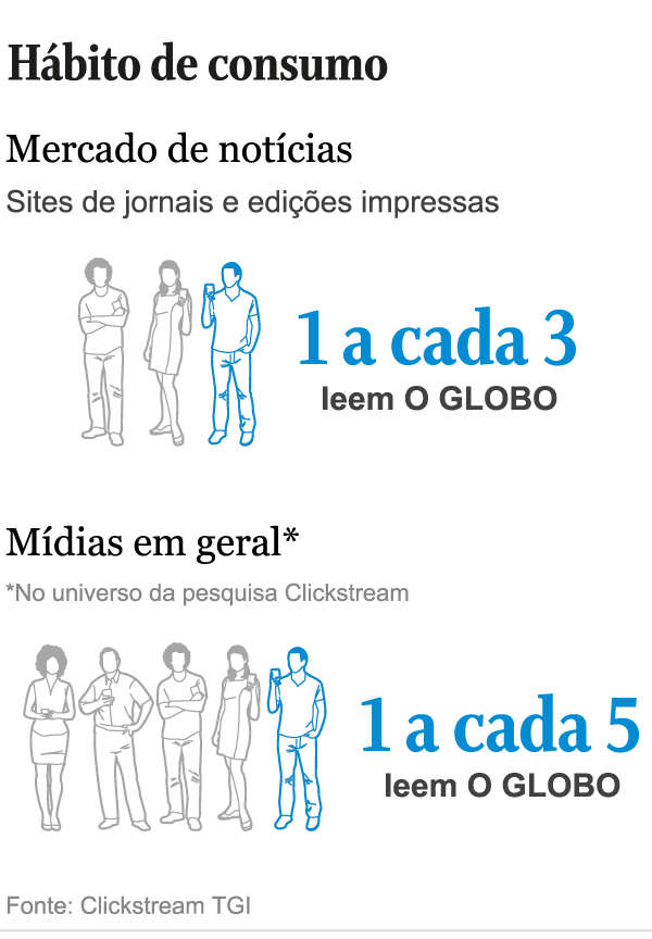 Pesquisa da Clickstream TGI revela que 1 a cada 5 pessoas leem O GLOBO, em sua edição digital ou impressa. Dentre aqueles que têm o hábito de se informar por jornais, 1 em cada 3 consomem O GLOBO. O jornal alcança 35,4% desses leitores, à frente da “Folha” (34,4%) e do “Estado” (23,5%). O levantamento abrange um universo de 89,4 milhões de indivíduos.