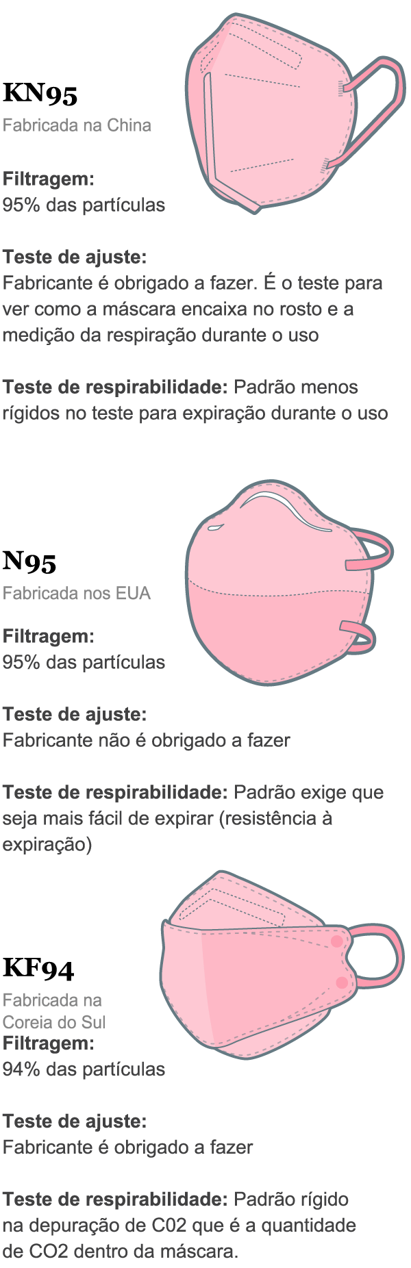 A preocupação é ainda maior com as máscaras do tipo KN95, que, com seus elásticos que se prendem na orelha (e não atrás da cabeça), não necessariamente se fixam bem em torno do rosto.